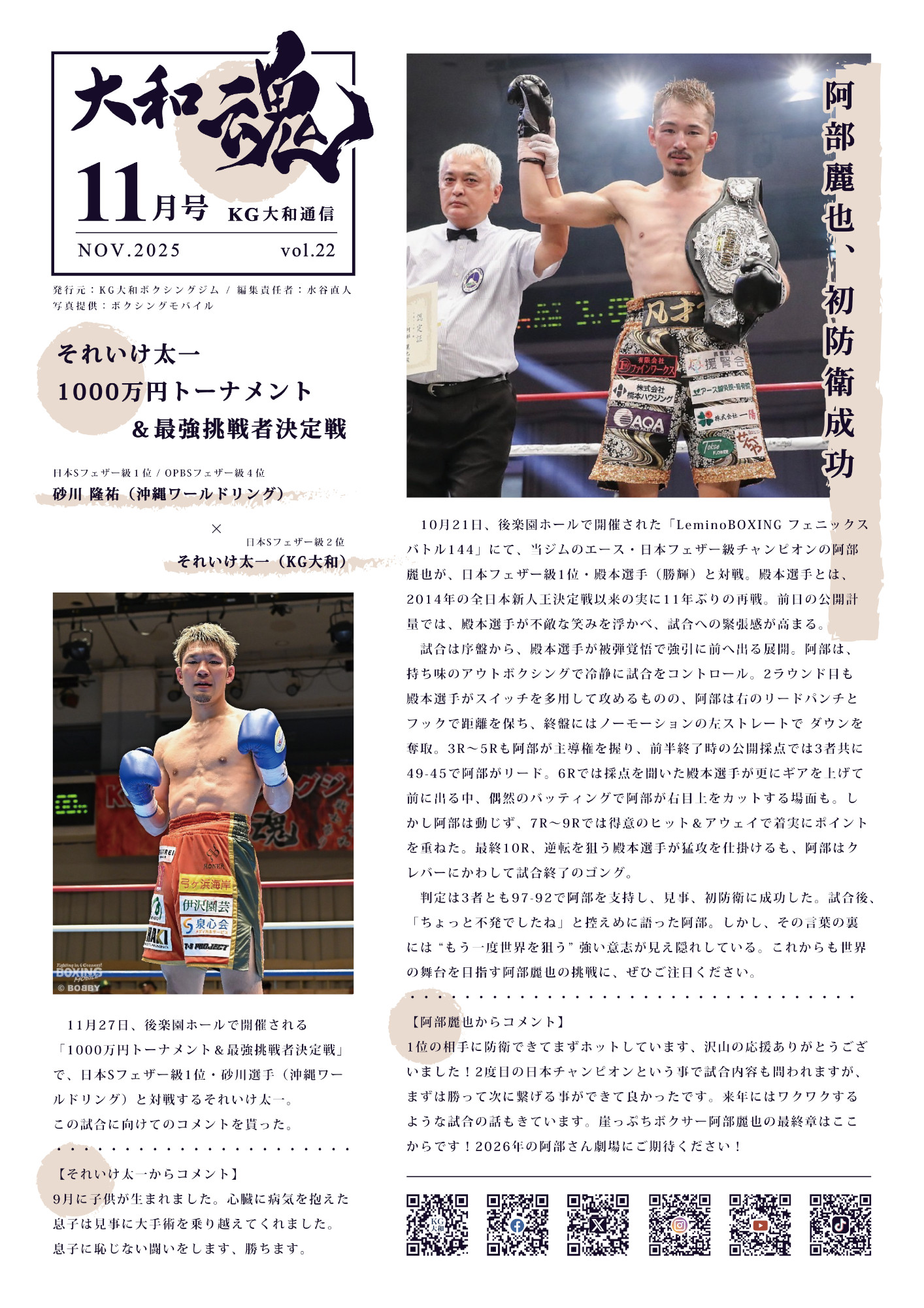 『KG大和通信【大和魂】』2025年11月号が発行されました!是非ご覧下さい😊⭐阿部麗也日本フェザー級タイトル初防衛成功!⭐それいけ太一1000万円トーナメント&最強挑戦者決定戦へ