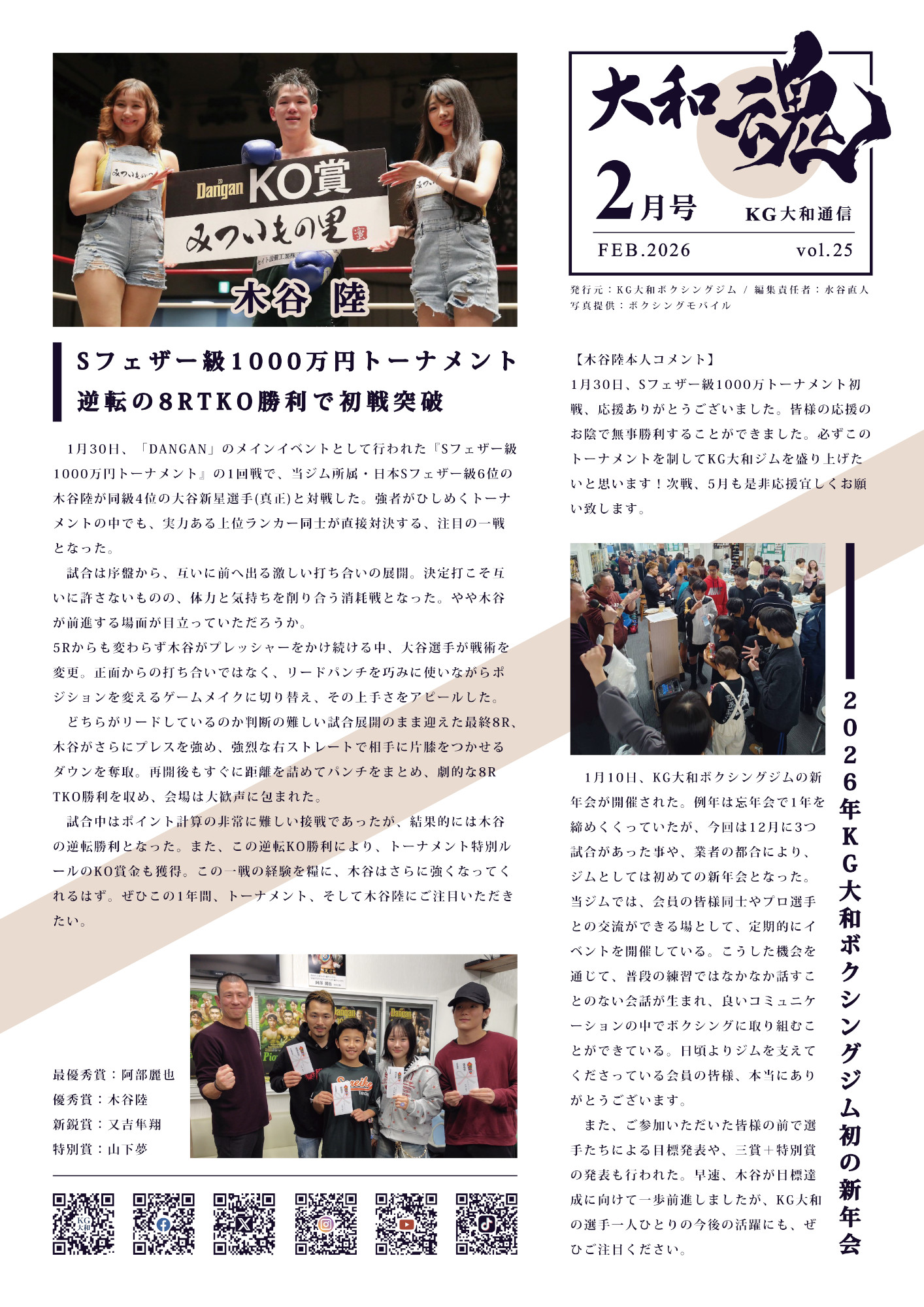 『KG大和通信【大和魂】』2026年2月号が発行されました!是非お読みください😊⭐木谷陸 1000万円トーナメント初戦!⭐ジム初の新年会開催♪
